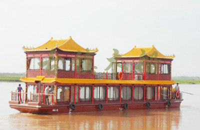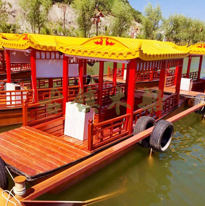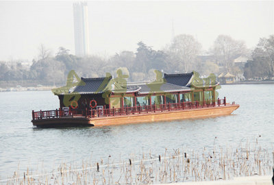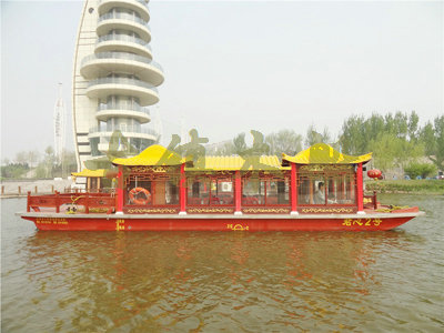 畫舫船就是裝飾古典華麗的游船,是"中國(guó)風(fēng)"的仿古游船,結(jié)合古典園林建筑,體現(xiàn)了中華文明的古典藝術(shù).畫舫船豪華而又古典,船上的建筑按照中國(guó)古代建筑里的亭臺(tái)樓閣,建筑工藝之復(fù)雜,要求之嚴(yán)格,仿古畫舫游船的特點(diǎn)飛檐翹角、玲瓏精致的四角亭子逐漸成形,赫然立于船頭,美人靠、盤龍柱子、彩畫……龍柱上的浮雕盤龍和祥云一層扣著一層,層層錯(cuò)落有致,雕刻精細(xì)到盤龍身上的每一個(gè)鱗片都細(xì)細(xì)可數(shù),古代皇家標(biāo)志性元素,在畫舫船上體現(xiàn)的淋漓盡致。除了雕刻、花窗,整條船還有一個(gè)看點(diǎn),那就是弧線優(yōu)美、高高翹起的船尾。游船并不大,長(zhǎng)約10米、寬3米,但是整體看起來(lái)堪稱一件藝術(shù)品。船尾的雕花欄桿與船艙、船頭的雕刻遙相呼應(yīng),船身四周貼著浮雕祥云,給整條船增添了富貴、華麗的氣質(zhì)。